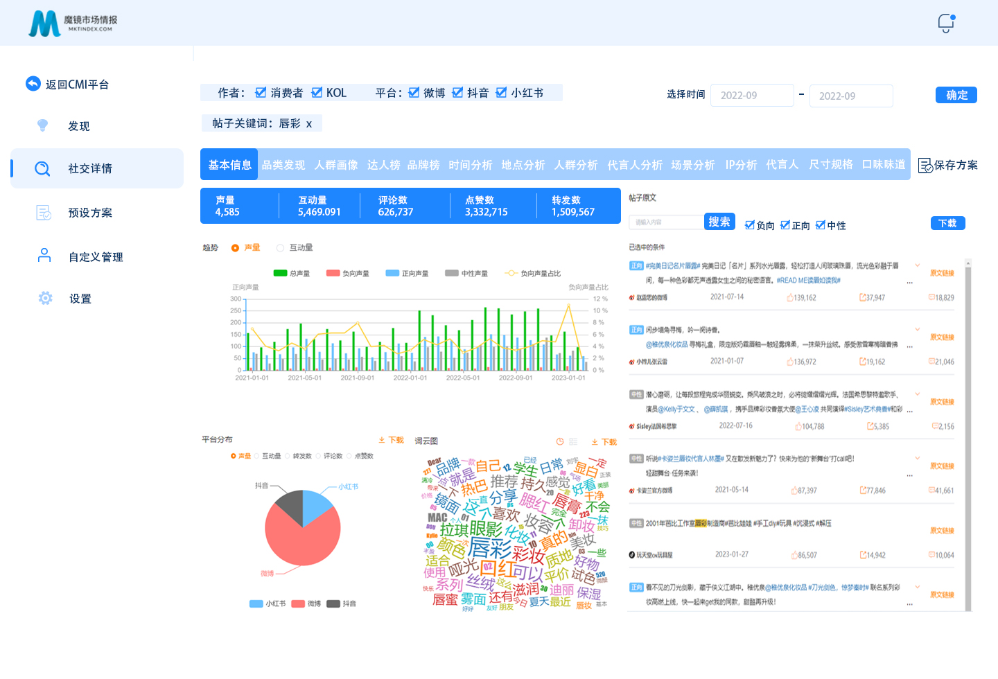 结果展示包含声量互动趋势、情感判断、词云图、平台分布等多维度监测分析,了解用户真实消费需求